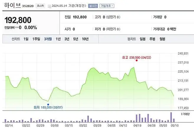 Продолжающаяся вражда междуЯ ОБОЖАЮГенеральный директор Мин Хи Джин иДВИЖЕНИЯнаносит ущерб акционерам: цена акций HYBE упала ниже отметки в 200 000 вон. 13 мая цена акций HYBE упала на 7700 вон, достигнув диапазона в 190 000 вон. Это снижение знаменует собой значительное снижение по сравнению с почти 240 000 вон, наблюдавшимися всего 20 дней назад.